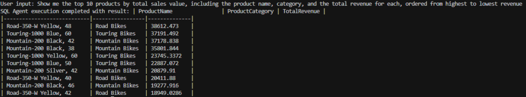 Since this is just a console based setup, the agent was given a query below in plain English and it took hardly a few seconds for it to respond accurately against the data in SQL Azure database.