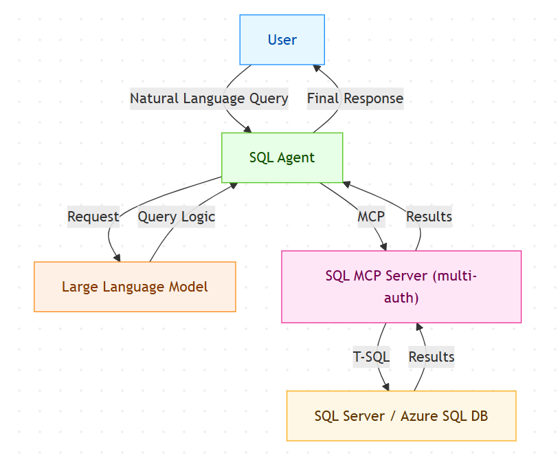 The official MCP server from Azure Samples (SQLMcp) is a great starting point, but its Node.js version is locked to Azure AD interactive auth, a browser-based flow unsuitable for headless agents or non-Azure setups. I extended the server code to handle: